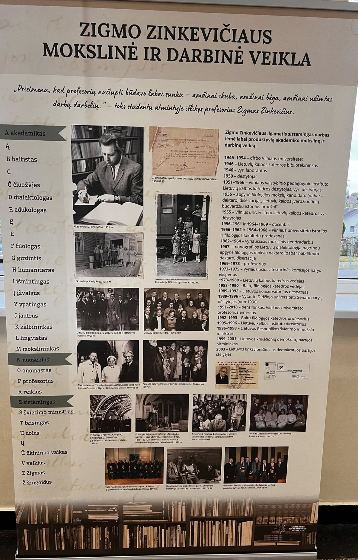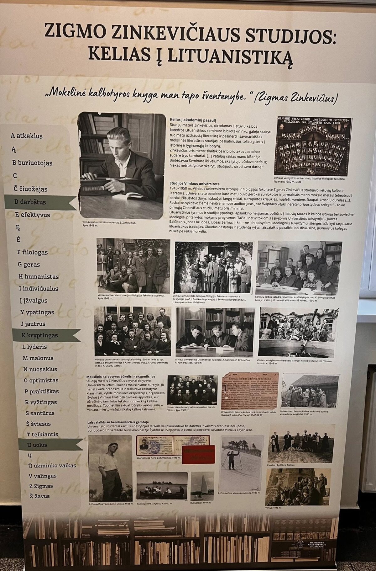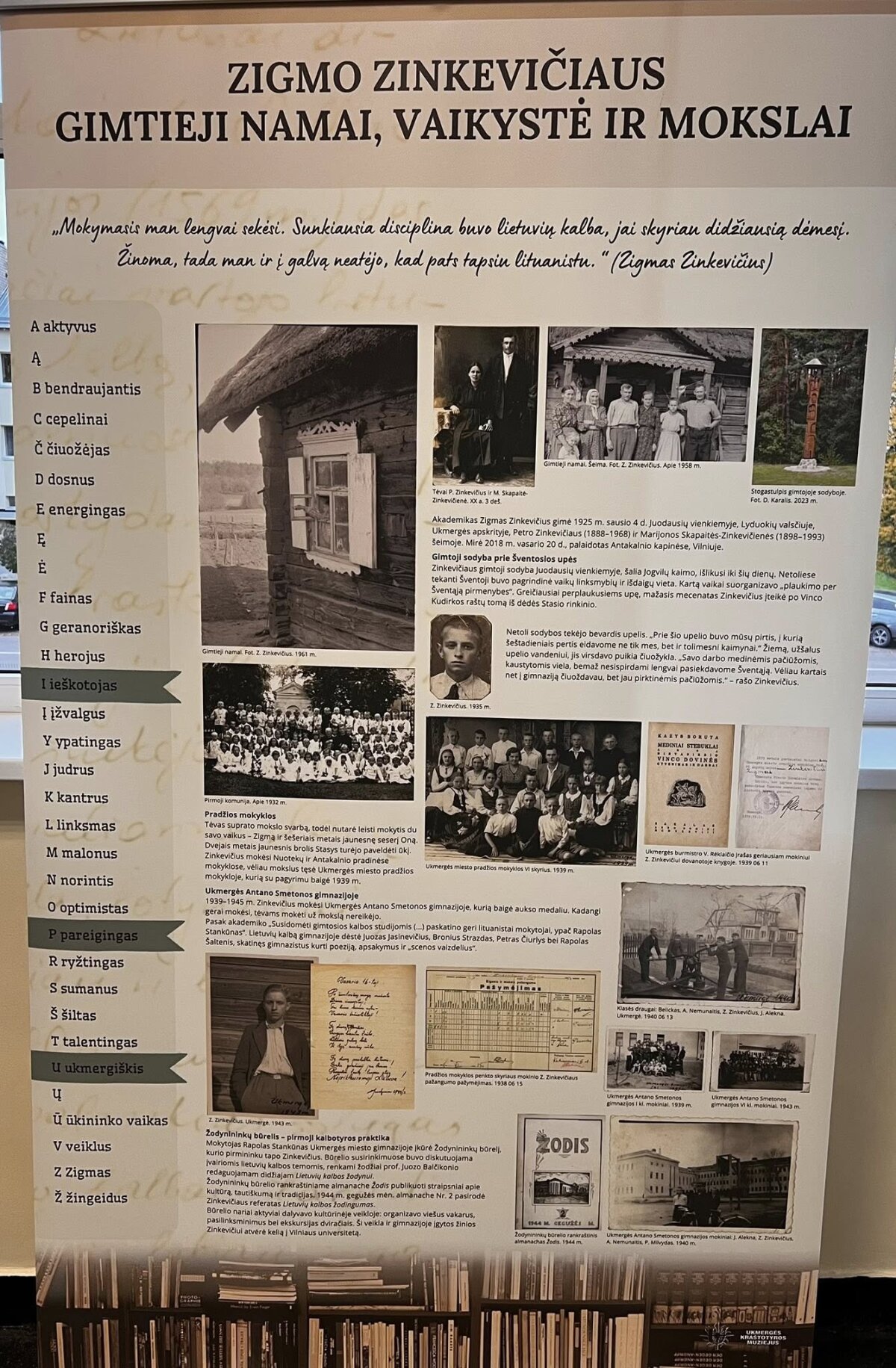 Iš parodos informacinio stendo: 1939–1945 m. Zinkevičius mokėsi Ukmergės Antano Smetonos gimnazijoje, kurią baigė aukso medaliu. Kadangi gerai mokėsi, tėvams mokėti už mokslą nereikėjo.