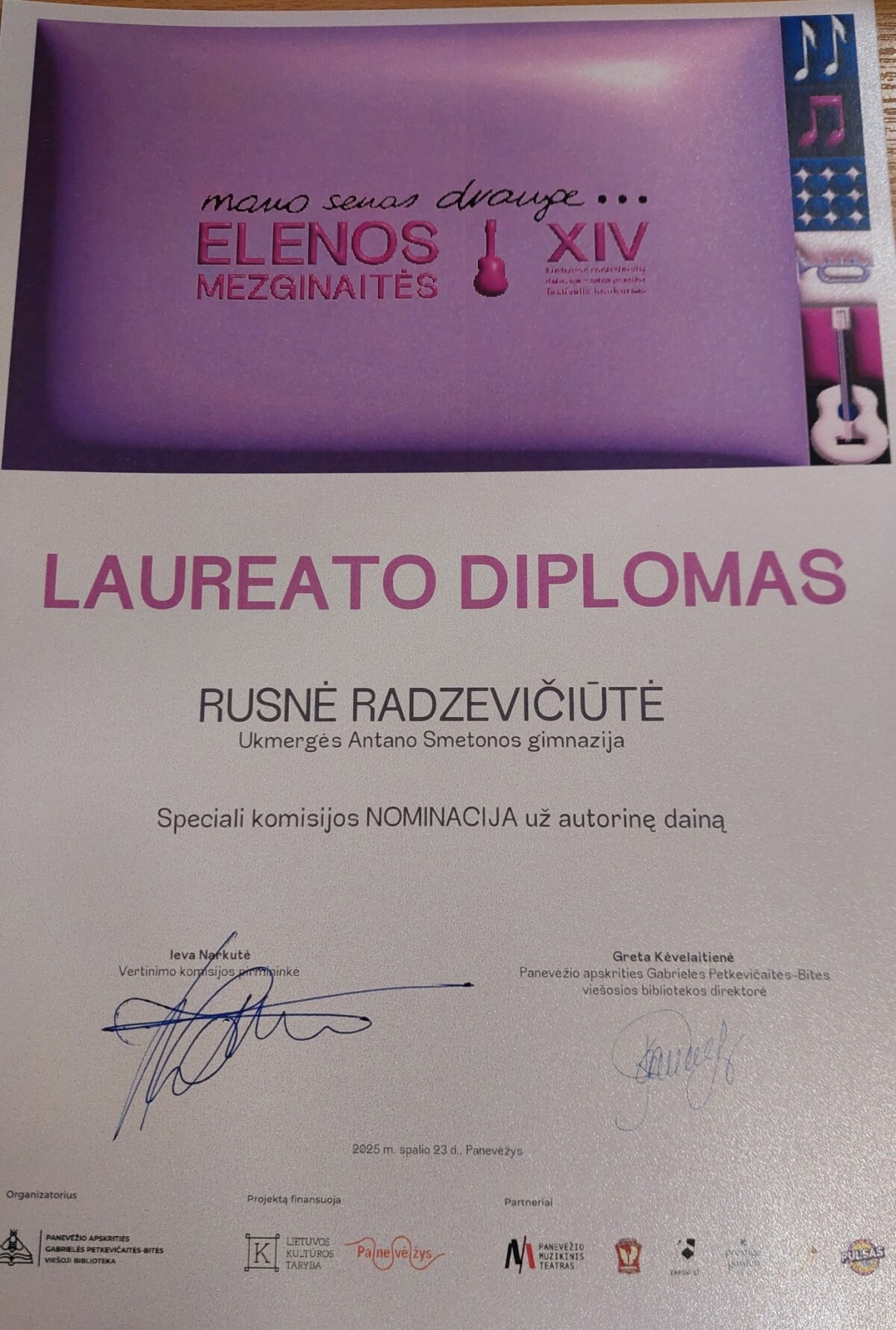 Garbi komisija (komisijos pirmininkė Ieva Narkutė, Elenos Mezginaitės dukra Mėta Kvetkienė, dainų autorius, atlikėjas Gytis Ambrazevičius, muzikos mokytoja Ingrida Bučinskienė) išklausiusi kūrinius atrinko devynis moksleivius laureatų koncertui, kurio klausėsi pilnutėlė Panevėžio muzikinio teatro salė. Tarp jų ir Rusnė Radzevičiūtė (IIId klasės mokinė), kuriai buvo suteikta speciali komisijos nominacija už autorinę dainą. Laureato diplomas už dainą „Amžinai“ (m.ir ž. Rusnės Radzevičiūtės). Džiaugiamės.