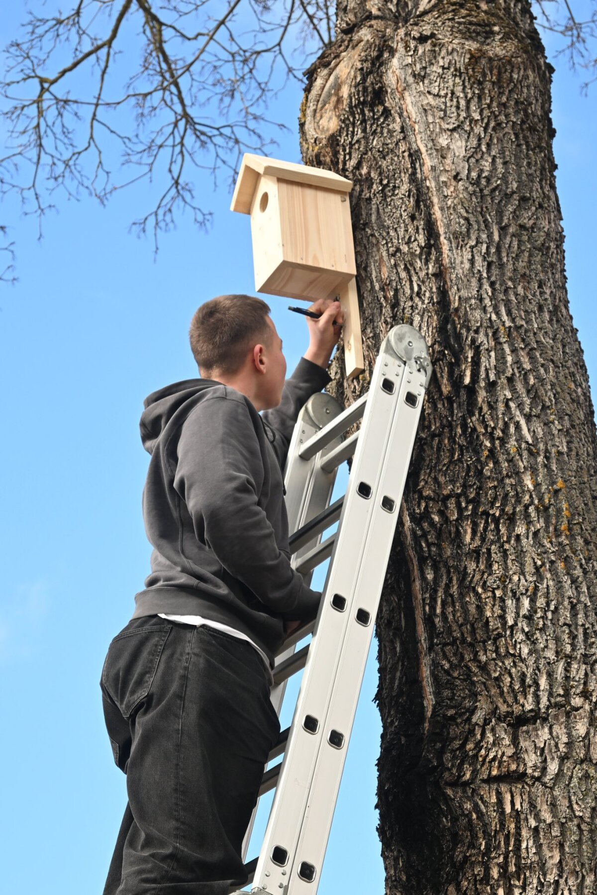 Teorines žinias apie biologinę įvairovę vainikavo prasmingas darbas – gimnazijos kieme iškelti nauji inkilai laukia giesmininkų.