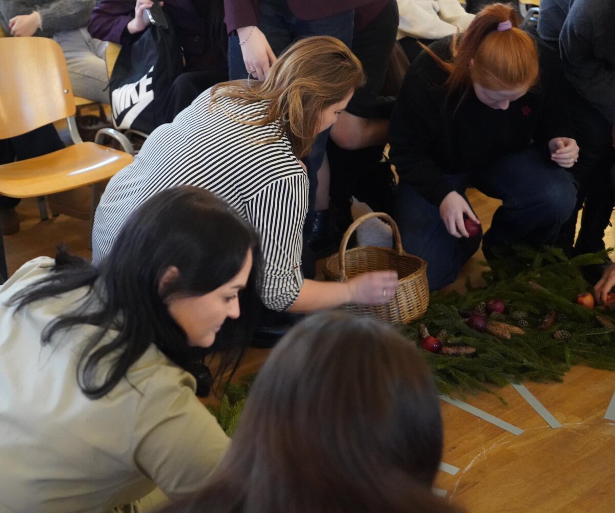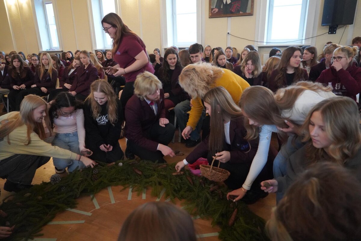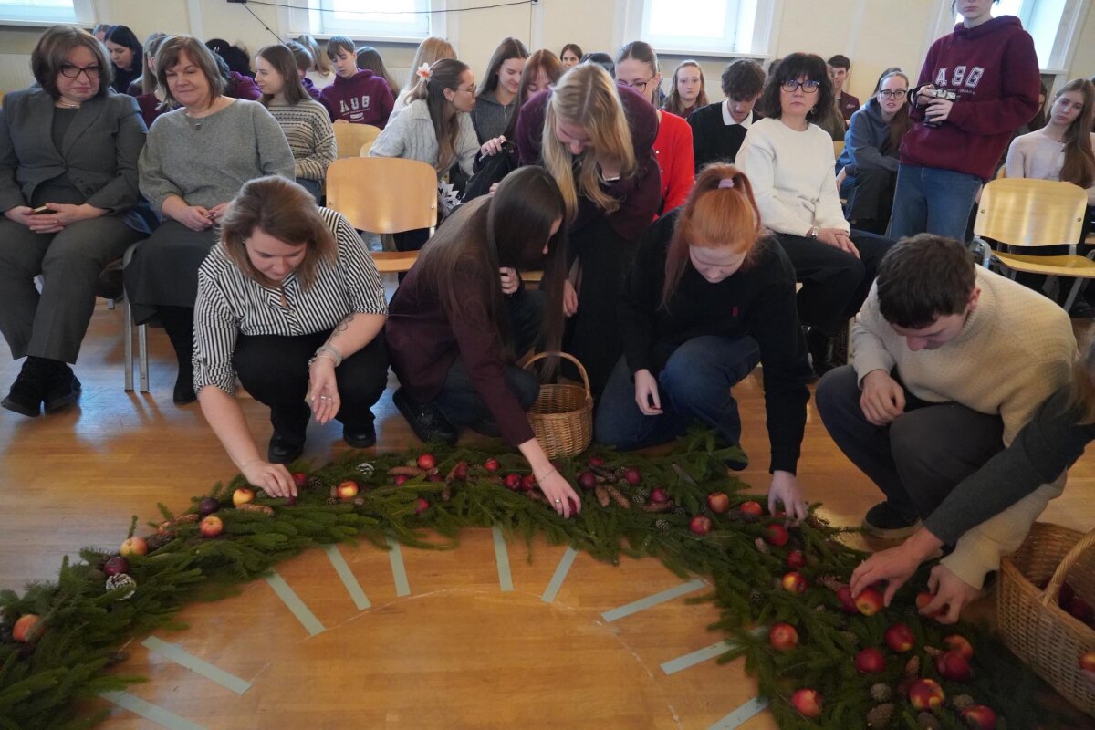 Mokytojo Vytauto pakviesti, pradėjome: mokytojai ir svečiai tiesė kelius, pirmokai pynė pagrindą – dėjo žalias eglės šakeles, kurios simbolizuoja viltį, kad viskas vėl atgis. Antrokai vainiką puošė kankorėžiais, trečiokai – obuoliais. Gimnazijos darbuotojai padabino žaisliukais, o vyriausi, ketvirtokai, snaigėmis. Advento rytą praturtino gimnazisčių šokis bei dviejų gimnazistų ansamblių ir choro atliktos dainos. Nupintas adventinis vainikas papuošė gimnazijos erdves, o dalis jo, kartu su mūsų šiltais linkėjimais, buvo perduota „Ryto“ ugdymo centrui.